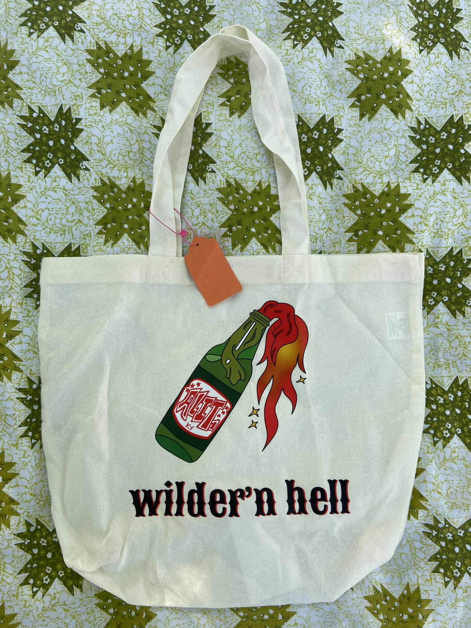 reduce, reuse, revolt! tote around this wilder'n hell design featuring original artwork from r. rue