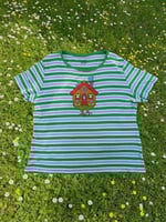 this repurposed striped tee was locally thrifted and features original artwork by r. rue. it is 100% cotton, vintage mountain lake brand, size large.